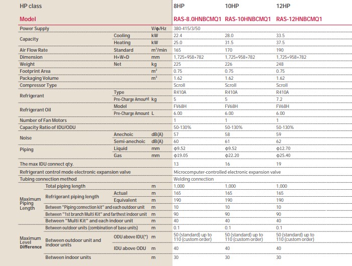 LG VRF Outdoor Units come in 3 variations: Multi V 5, Multi V S, and Multi V Water 5. LG Multi V 5: available in ‘Hot and Cold’ and ‘Cooling Only’ options. 'Hot and cold' outdoor units are available from 8 HP, 10 HP, 12 HP, 14 HP, 16 HP, 18 HP, 20 HP, 22 HP, 24 HP, 26 HP. 'Cooling Only' outdoor units are available from 8 HP, 10 HP, 12 HP, 14 HP, 16 HP, 18 HP, 20 HP, 22 HP. LG Multi V S: These units are good for residences and small offices. 'Hot and Cold' units are available in 4 HP, 5 HP, 6 HP, 8 HP, 10 HP, 12 HP Three phase. 'Hot and Cold' units are also available in 4 HP, 5 HP, 6 HP, Single phase. 'Cooling Only' units are available in 5 HP, 6 HP, 14 HP. LG Multi V Water 5: These are water cooled VRF 'Hot and Cold' outdoor units with heat recovery mechanism. These units are available in 8 HP, 10 HP, 12 HP, 14 HP, 16 HP, 18 HP, 20 HP.